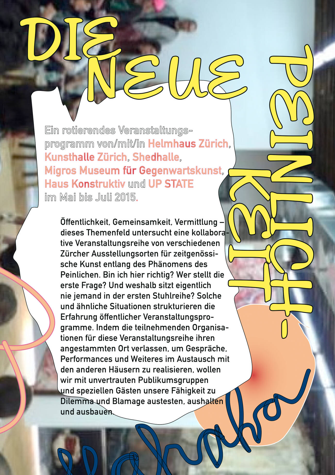 In conjunction with selected exhibitions or to shine a spotlight on vital issues, the Migros Museum für Gegenwartskunst occasionally holds special events in unconventional formats. We have explored local monuments in cooperation with the City of Zurich; teamed up with other cultural institutions in the city to probe the phenomenon of awkwardness and embarrassment in art; and built our own 3D glasses.